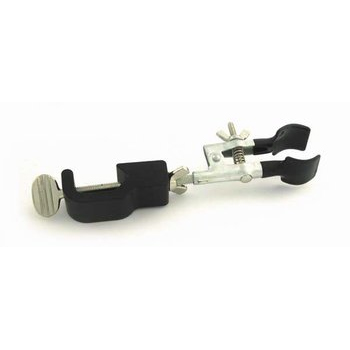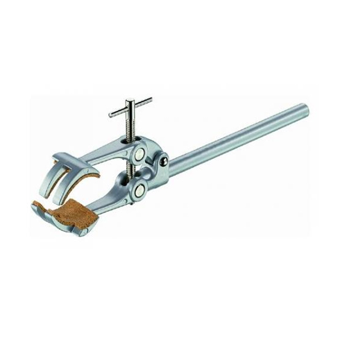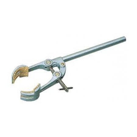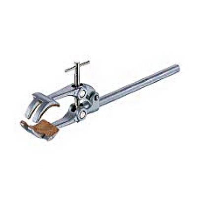 Chrome plated metal with double pronged jaws coated in PVC. For use with burettes and condensers. Can hold objects of 12 - 45 mm. dia.