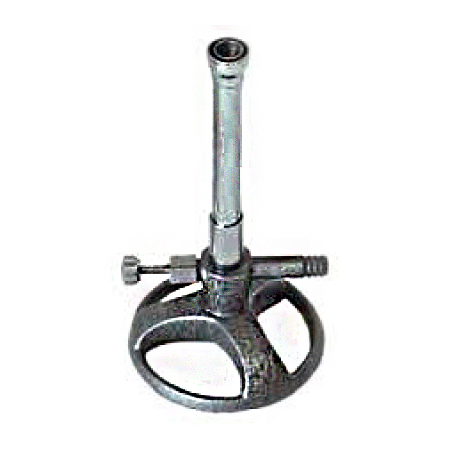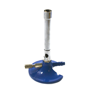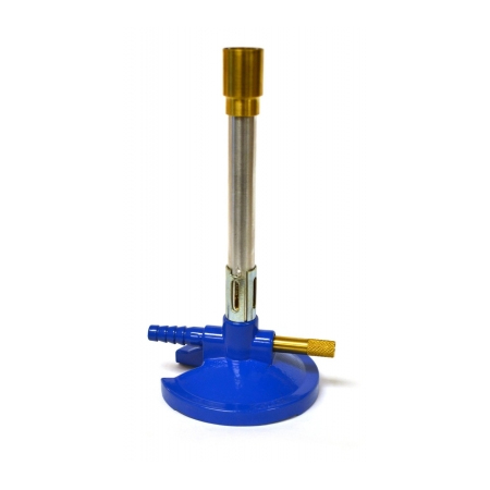 Nickel plated burner tube with regulated air regulator and connector, mounted on steel base, to be used with Butane / Propane gas. 3 preset positions on the air regulator for air / gas mixing.