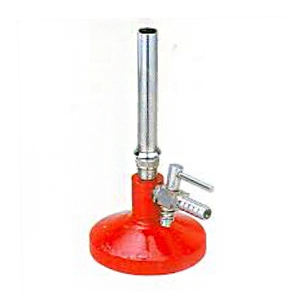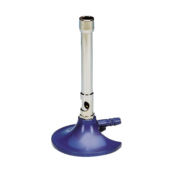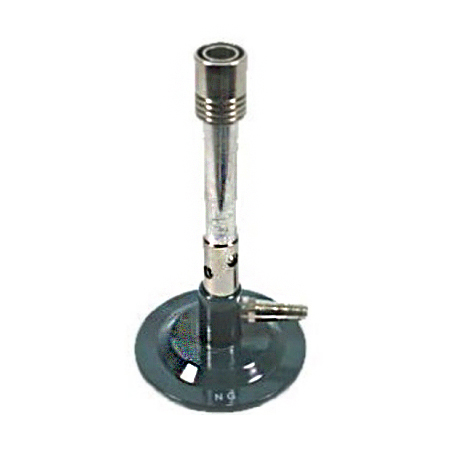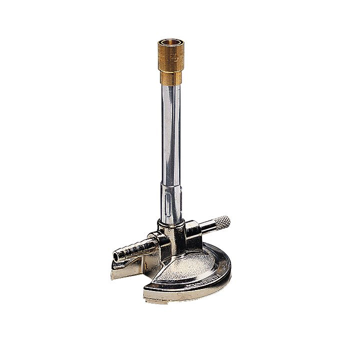 Nickel plated burner tube with rotatable air regulator & cylindrical riffled connector, mounted on base, fitted with stopcock to control gas. To be used with LPG gas.