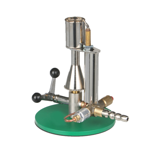 Nickel plated burner tube with regulated air regulator and cylindrical connector. Mounted on pressure die casted base.