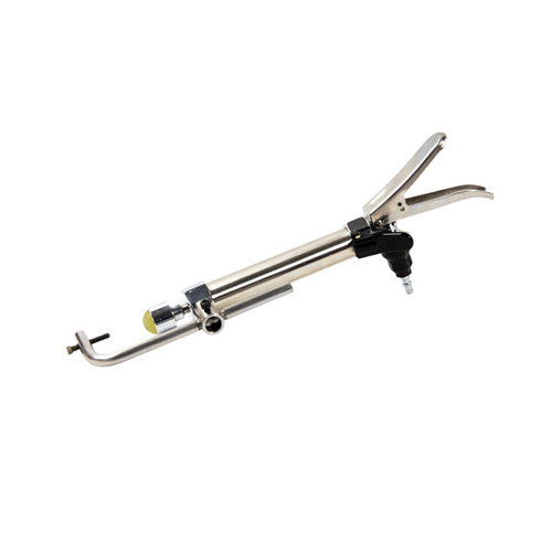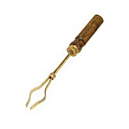Two prong, diecasted with other parts of plated brass, accepts articles from 15-60 mm. dia. actuated by nickel plated brass pummels and twin screw, the jaws are cork lined. Fitted with 15 cms. long mild steel rod.