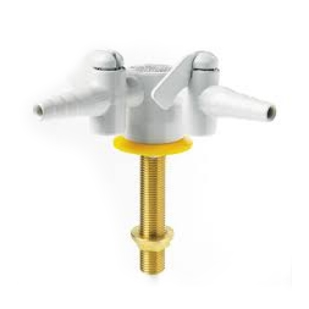 Brass, lever handle, spring loaded, locking arrangement to ensure rotation does not go beyond 90�, standard 3 mm. bore, inlet � inches BSP, flange dia. 54 mm. with three screws to fix on bench or any other surface. Finished in black / chrome : Single Finished in black / chrome : Double.