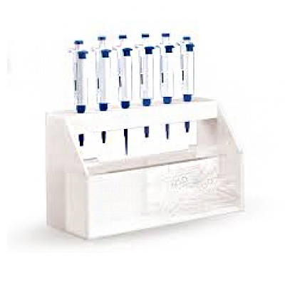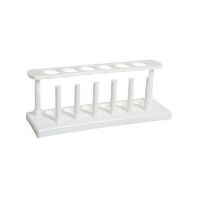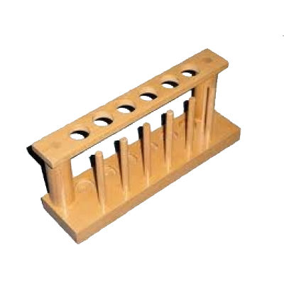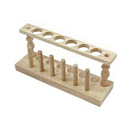 Wooden, polished stand with drilled holes, 2 of 25 mm. dia. and 4 of 20 mm. to accommodate 6 tubes with overall height of 9 cms. and length of 20 cms. Vertical pins are provided for quick drying of the test tubes. Also available for 12 tubes, with 2 holes of 25 mm. dia and 10 holes of 20 mm. dia.