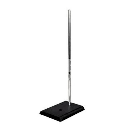 Retort stands with aluminium support rods and cast iron bases. Base finished in silver-grey enamel to resist corrosion.