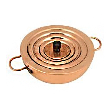 Hemispherical, made of copper sheet, with two handles and a set of concentric rings.