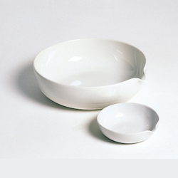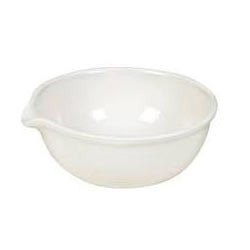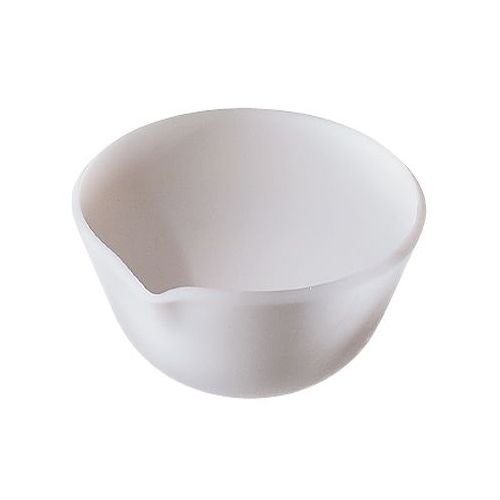 Porcelain, with spout, deep form, flat bottom glazed except outside base.