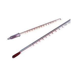White enamelled back and reinforced bulbs filled with Red /Blue spirit. General purpose stirring thermometers. Supplied with non roll fitting. Diameter 6.5 mm. approx. and 76 mm. Immersion. Graduated and supplied in case. RED / BLUE colour.
