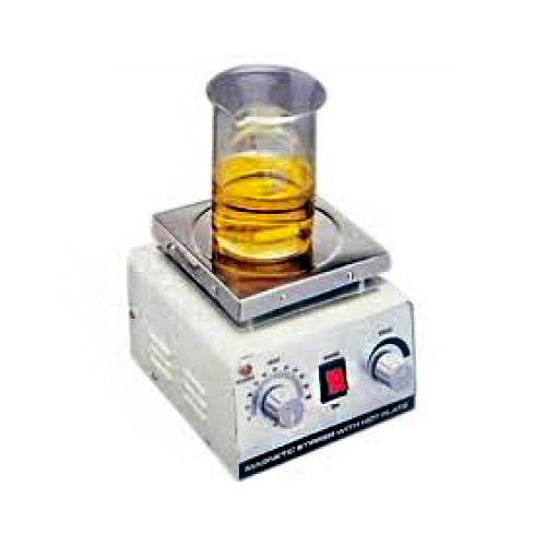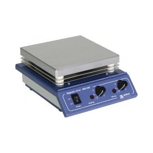 Housed in sheet metal casing and suitable for stirring operation upto 2 liters. Top stainless steel size 20 x 20 cm. Fitted with continuously variable energy regulator control. Operates on 230 volts 50 Hz. A.C. fitted with an hot plate with heating capacity 300 watts. Heating is controlled by an energy regulator which regulates the heating at any percentage of the total heating capacity of the heater.