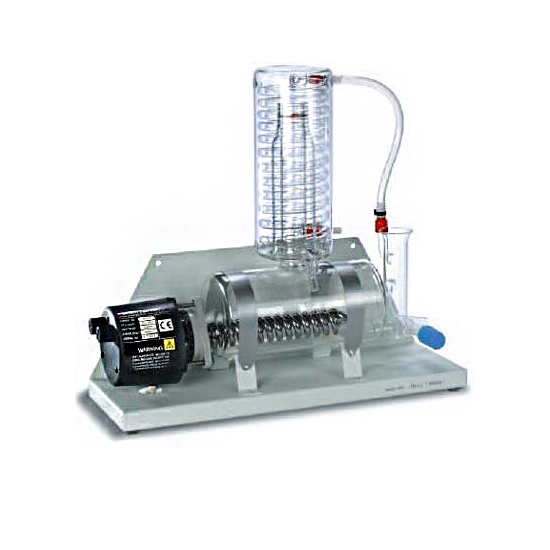 Manesty type, wall mounting still, designed for continuous automatic and efficient production of high quality distilled water. The raw water enters at the lower end of the condenser pipe, circulating around the condenser tube and ultimately filling the boiling chamber to a height predetermined by means of a weir. The descending steam, in the condenser tube thus pre - heats the ascending column of raw water and tends to expel gases dissolved in it. The stills are so designed that these expelled gases can be vented to atmosphere. The steam generated in the boiling chamber passes through a system of baffles on its way to the condenser tube. The baffles are so arranged that the vapours change direction.
